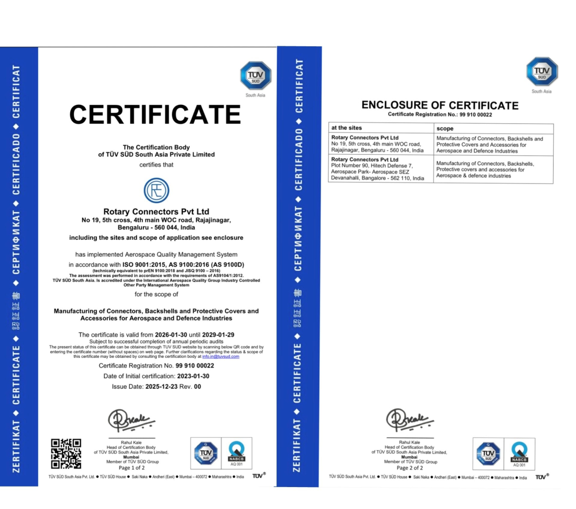 This certification positions Rotary Connectors Pvt. Ltd. as a trusted and compliant supplier in global defense and aerospace supply chains.
